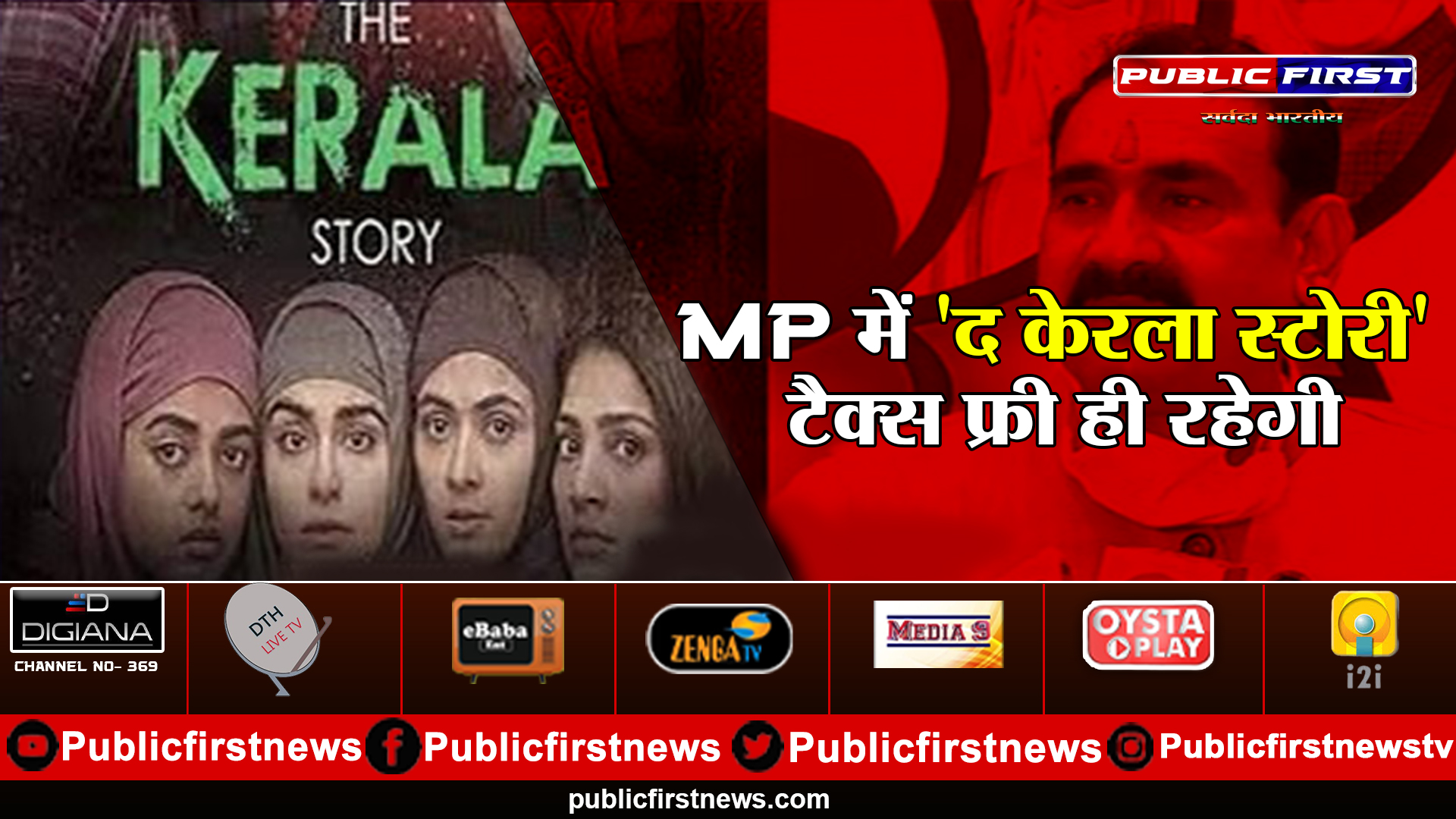 पब्लिक फर्स्ट ब्यूरो।मध्यप्रदेश में ‘द केरला स्टोरी’ फिल्म टैक्स फ्री ही रहेगी। गृहमंत्री नरोत्तम मिश्रा ने खुद इसकी पुष्टि की है। गुरुवार उन्होंने कहा कि मुख्यमंत्री शिवराज सिंह चौहान ने फिल्म को ट्रैक्स फ्री करने की घोषणा की थी। फिल्म टैक्स फ्री है और टैक्स फ्री रहेगी। किसी भी फेक आदेश को नहीं मानें। सिनेमा घरवालों और लोगों से अपील है कि वे भ्रम में न आएं।