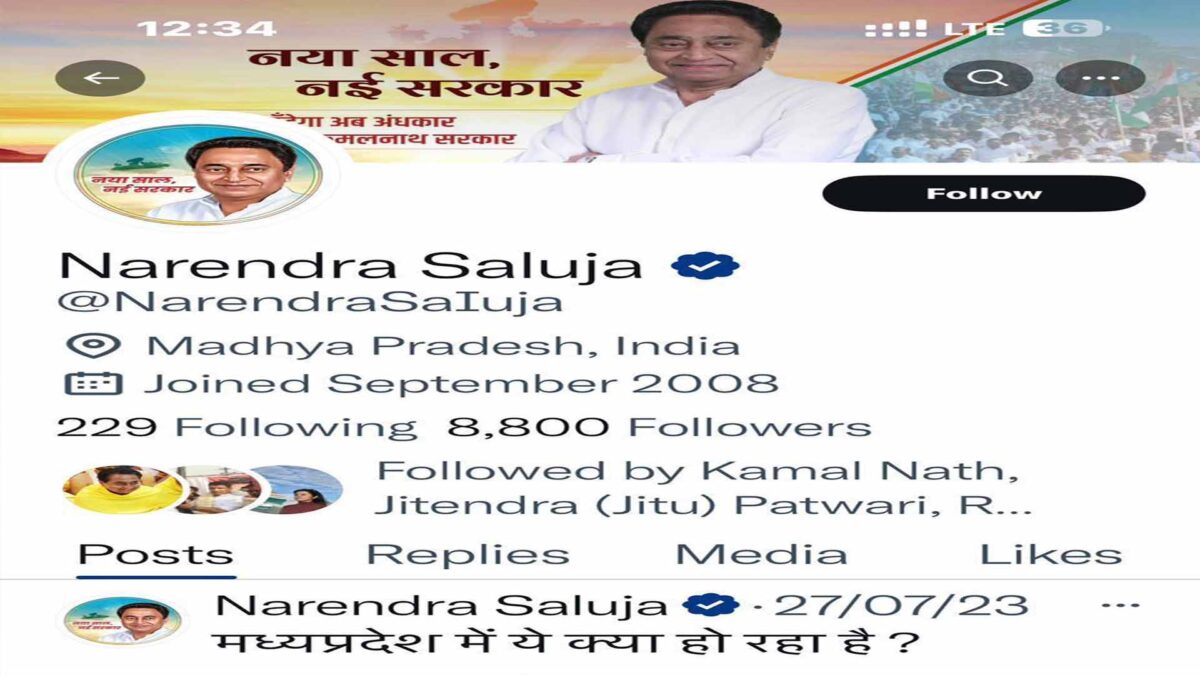 मप्र भाजपा के प्रवक्ता और कभी कांग्रेस प्रदेश अध्यक्ष कमलनाथ के करीबी रहे, नरेन्द्र सलूजा ने बड़ा खुलासा किया है । नरेन्द्र सलूजा ने कहा कि कांग्रेस ने ना केवल उनका फ़र्ज़ी ट्विटर अकाउंट बनाया बल्कि हैरानी तो ये है कि इस फ़र्ज़ी ट्विटर अकाउंट को, मप्र कांग्रेस अध्यक्ष कमलनाथ खुद फ़ॉलो कर रहे है । सलूजा ने फ़र्ज़ी ट्विटर अकाउंट की शिकायत, पुलिस को कर दी है ।