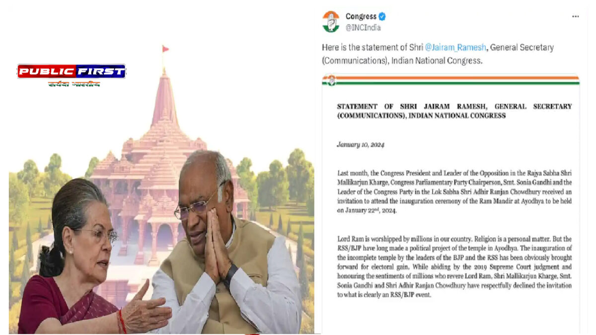 अयोध्या में 22 जनवरी को होने वाले रामलला के प्राण प्रतिष्ठा कार्यक्रम में जाने से कांग्रेस ने इनकार कर दिया है। सोनिया गांधी, मल्लिकार्जुन खड़गे, अधीर रंजन समेत सभी कांग्रेस नेता इस कार्यक्रम में शामिल नहीं होंगे। कांग्रेस ने कहा है कि ये कार्यक्रम भाजपा ने राजनीतिक लाभ के लिए आयोजित किया है।