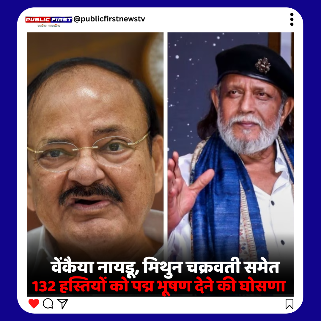 गणतंत्र दिवस की पूर्व संध्या पर गुरुवार को केंद्र सरकार ने पद्म पुरस्कारों की घोषणा की. पद्म विभूषण, पद्म भूषण और पद्मश्री तीनों श्रेणी में मिलाकर 132 हस्तियों के नामों की घोषणा की गई. इनमें विभूषण के लिए 5, पद्म भूषण के लिए 17 और पद्मश्री के लिए 110 नामों की घोषणा की गई है. असाधारण और विशिष्ट सेवा के लिए दिए जाने वाले पद्म विभूषण के लिए पांच हस्तियों के नामों की घोषणा की गई, जिनमें पूर्व उपराष्ट्रपति वेंकैया नायडू, अभिनेता चिरंजीवी, हिंदी फिल्मों की मशहूर अदाकार वैजयंती माला, मशहूर नृत्यांगना पद्मा सुब्रमण्यम और सुलभ इंटरनेशनल के संस्थापक बिंदेश्वर पाठक (मरणोपरांत) शामिल हैं. उच्च कोटि की सेवा के लिए दिए जाने वाले पद्म भूषण पुरस्कारों के लिए 17 लोगों के नामों की घोषणा की गई. इनमें मशहूर फिल्म अभिनेता मिथुन चक्रवर्ती और पूर्व केंद्रीय मंत्री और उत्तर प्रदेश के राज्यपाल रहे राम नाईक नाम भी शामिल हैं.