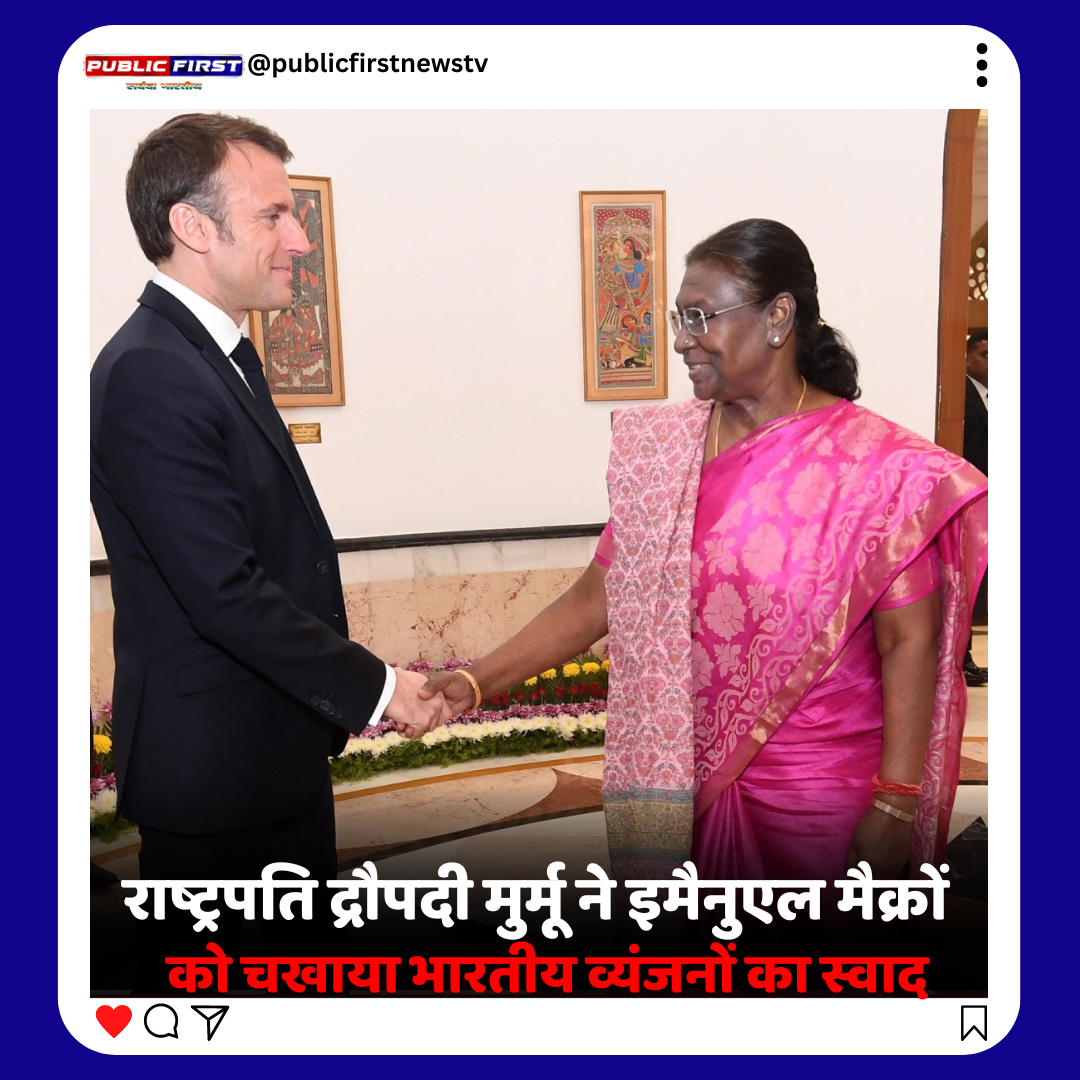 गणतंत्र दिवस परेड में इस वर्ष के मुख्य अतिथि फ्रांसीसी राष्ट्रपति के सम्मान में राष्ट्रपति भवन में भोज आयोजित किया गया. इमैनुएल मैक्रों ने राष्ट्रपति द्रौपदी मुर्मू द्वारा आयोजित भोज में पारंपरिक भारतीय व्यंजनों का स्वाद लिया. इस भोज में फ्रांसीसी राष्ट्रपति को केसर बादाम शोरबा से लेकर सरसों का साग, मक्के की रोटी, जीरा आलू और पुदीना रायता सहित पारंपरिक भारतीय व्यंजनों की स्वादिष्ट विविधता परोसी गई.