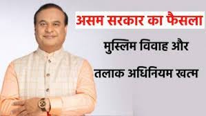असम सरकार ने असम मुस्लिम विवाह और तलाक पंजीकरण कानून 1930 को निरस्त कर दिया। यह निर्णय मुख्यमंत्री हिमंत बिस्वा सरमा की अध्यक्षता में राज्य मंत्रिमंडल की बैठक के दौरान लिया गया। असम सरकार ने इसे समान नागरिक संहिता की दिशा में एक बड़ा कदम बताया।