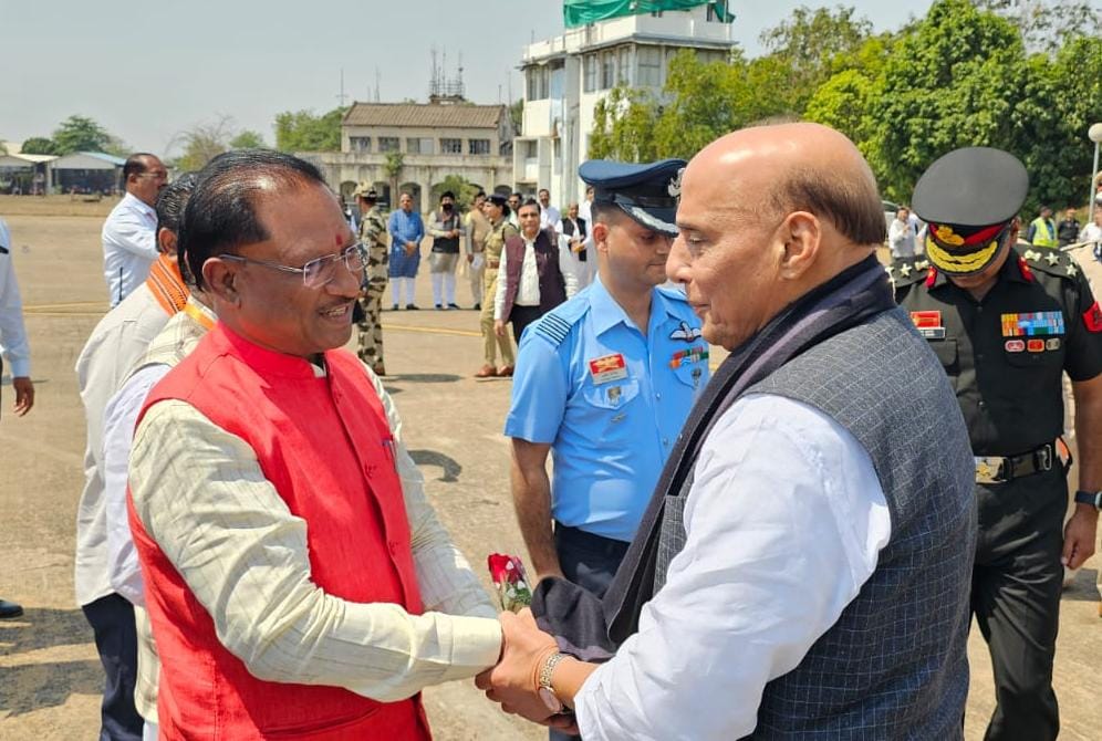केंद्रीय रक्षा मंत्री राजनाथ सिंह के आज राजधानी रायपुर के स्वामी विवेकानंद एयरपोर्ट माना पहुंचने पर मुख्यमंत्री विष्णुदेव साय ने उनका आत्मीय स्वागत किया।