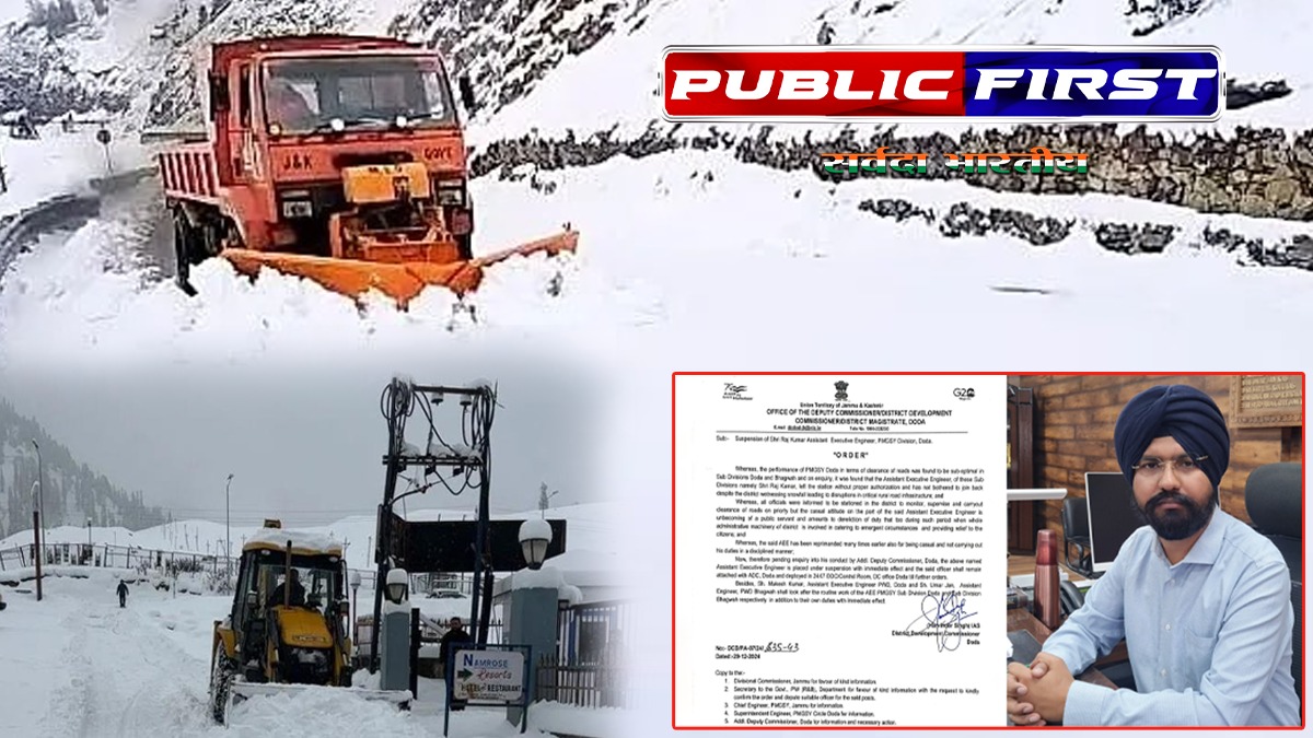 एक महत्वपूर्ण प्रशासनिक कार्रवाई में, पीएमजीएसवाई डिवीजन डोडा के सहायक कार्यकारी अभियंता (एईई) राज कुमार को तत्काल प्रभाव से निलंबित कर दिया गया है। यह कार्रवाई जिला विकास आयुक्त, डोडा हरविंदर सिंह द्वारा ग्रामीण सड़क बुनियादी ढांचे को प्रभावित करने वाली गंभीर बर्फबारी के दौरान घोर लापरवाही और ड्यूटी पर वापस रिपोर्ट करने में विफलता का हवाला देते हुए की गई थी।