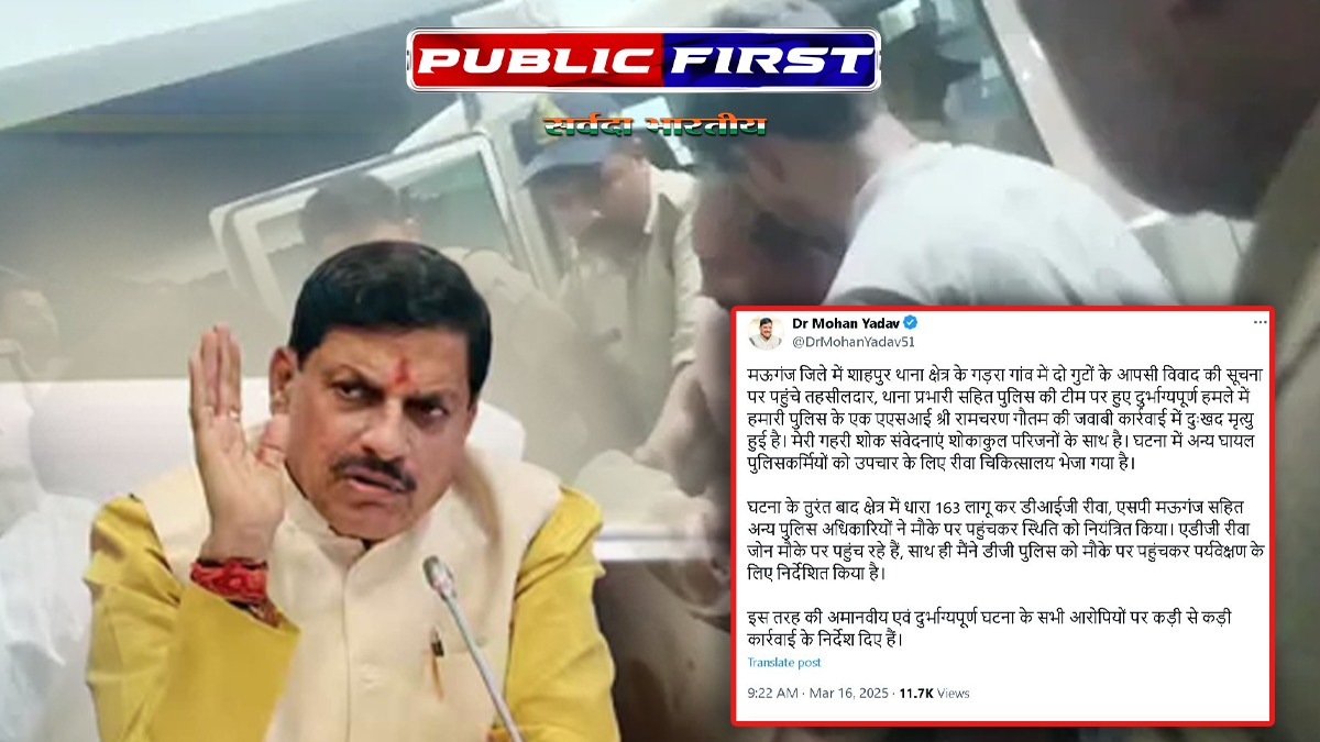 मप्र के मऊगंज जिले के शाहपुर थाना क्षेत्र के गड़रा गांव में दो गुटों के बीच विवाद की सूचना पर पहुंचे तहसीलदार, थाना प्रभारी सहित पुलिस दल पर दुर्भाग्यपूर्ण हमला हुआ, जिसमें एएसआई श्री रामचरण गौतम की जवाबी कार्रवाई में दुःखद मृत्यु हो गई। मुख्यमंत्री डॉ. मोहन यादव ने शोक संतप्त परिवार के प्रति गहरी संवेदनाएँ व्यक्त की हैं।