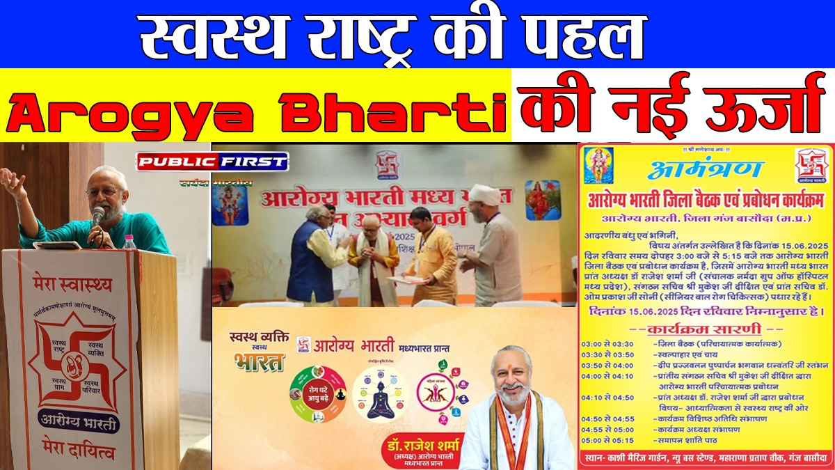 गंज बासौदा – 15 जून 2025 को रविवार दोपहर काशी मैरिज गार्डन, महाराणा प्रताप चौक में Arogya Bharti की जिला बैठक एवं प्रबोधन कार्यक्रम स्वास्थ्य और जागरूकता के संदेश से परिपूर्ण हुआ। मध्य भारत प्रांत अध्यक्ष Dr. Rajesh Sharma (नर्मदा ग्रुप ऑफ हॉस्पिटल, मध्य प्रदेश), संगठन सचिव श्री मुकेश दीक्षित और प्रांत सचिव डॉ. ओम प्रकाश सोनी की उपस्थिति में सामाजिक स्वास्थ्य सेवाओं पर आधारित मुहिम को नई दिशा मिली।