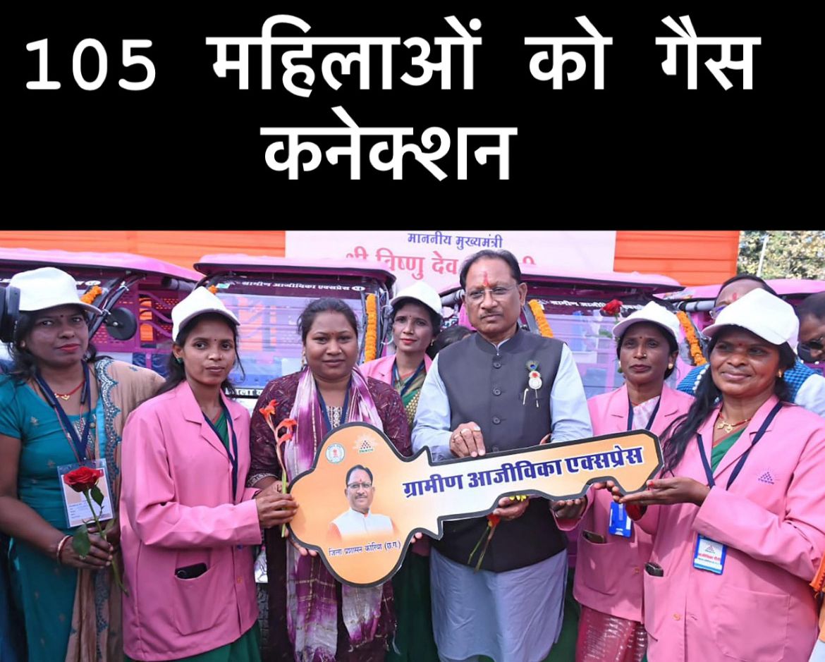 कार्यक्रम के दौरान प्रधानमंत्री उज्ज्वला योजना के अंतर्गत 105 पात्र महिला हितग्राहियों को निशुल्क गैस कनेक्शन प्रदान किए गए। इस पहल का उद्देश्य महिलाओं को स्वच्छ ईंधन उपलब्ध कराकर उनके स्वास्थ्य और जीवन स्तर में सुधार लाना है।