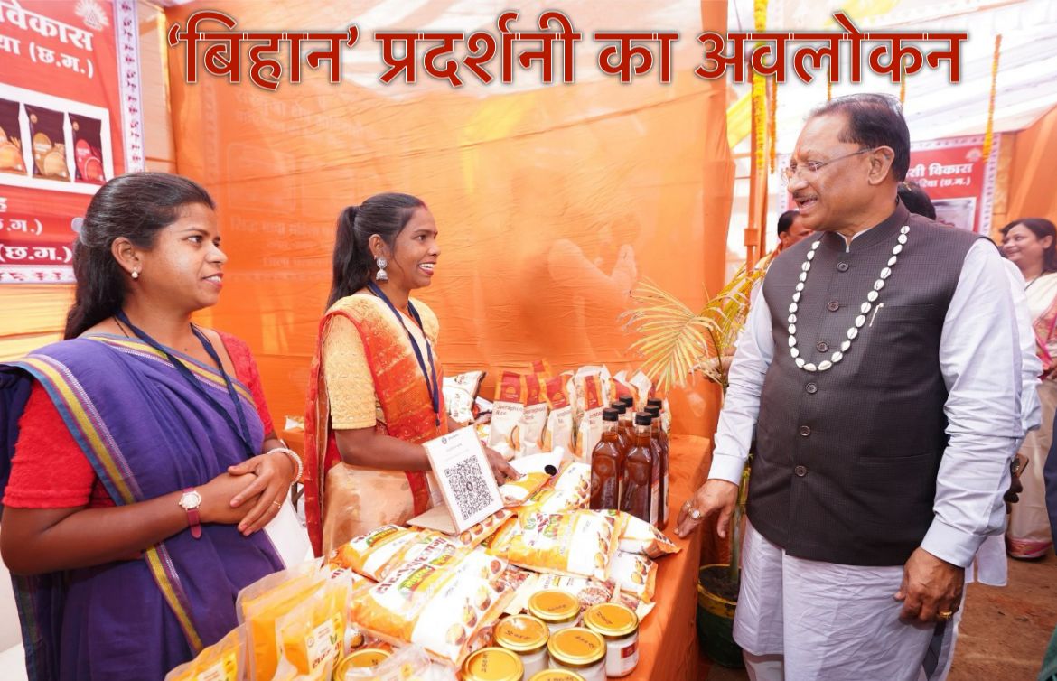 बैकुंठपुर स्थित जिला पंचायत परिसर में आयोजित कार्यक्रम के दौरान मुख्यमंत्री विष्णु देव साय ने ‘बिहान’ स्व-सहायता समूहों की बहनों द्वारा लगाई गई प्रदर्शनी का अवलोकन किया।