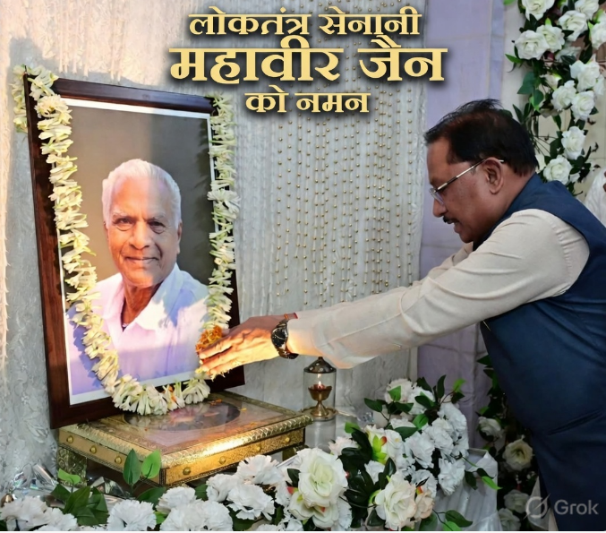 रायपुर 19 मार्च 2026/मुख्यमंत्री श्री विष्णु देव साय ने आज जशपुरनगर के वरिष्ठ सामाजिक कार्यकर्ता एवं लोकतंत्र सेनानी स्वर्गीय श्री महावीर प्रसाद जैन के निवास पहुंचकर उनके छायाचित्र पर पुष्प अर्पित कर श्रद्धांजलि दी।