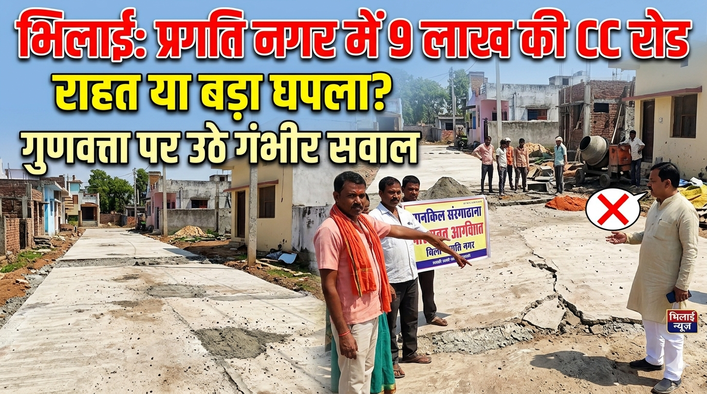भिलाई के प्रगति नगर क्षेत्र में बन रही करीब 9 लाख रुपये की CC रोड इन दिनों चर्चा और विवाद का विषय बन गई है। जिस सड़क का निर्माण स्थानीय लोगों को बेहतर सुविधा देने के उद्देश्य से किया जा रहा था, वही अब नाराज़गी, सवाल और आरोपों का केंद्र बनती नजर आ रही है।