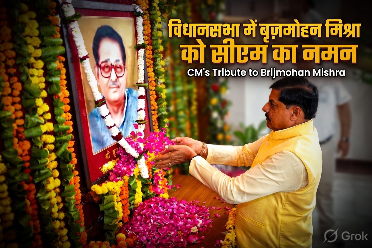 भोपाल स्थित मध्यप्रदेश विधानसभा परिसर में आज पूर्व विधानसभा अध्यक्ष स्वर्गीय बृजमोहन मिश्रा की जयंती पर उन्हें श्रद्धांजलि अर्पित की गई। इस अवसर पर मध्यप्रदेश के मुख्यमंत्री सीएम डॉ. मोहन यादव ने उनके चित्र पर पुष्प अर्पित कर नमन किया और उनके योगदान को याद किया।