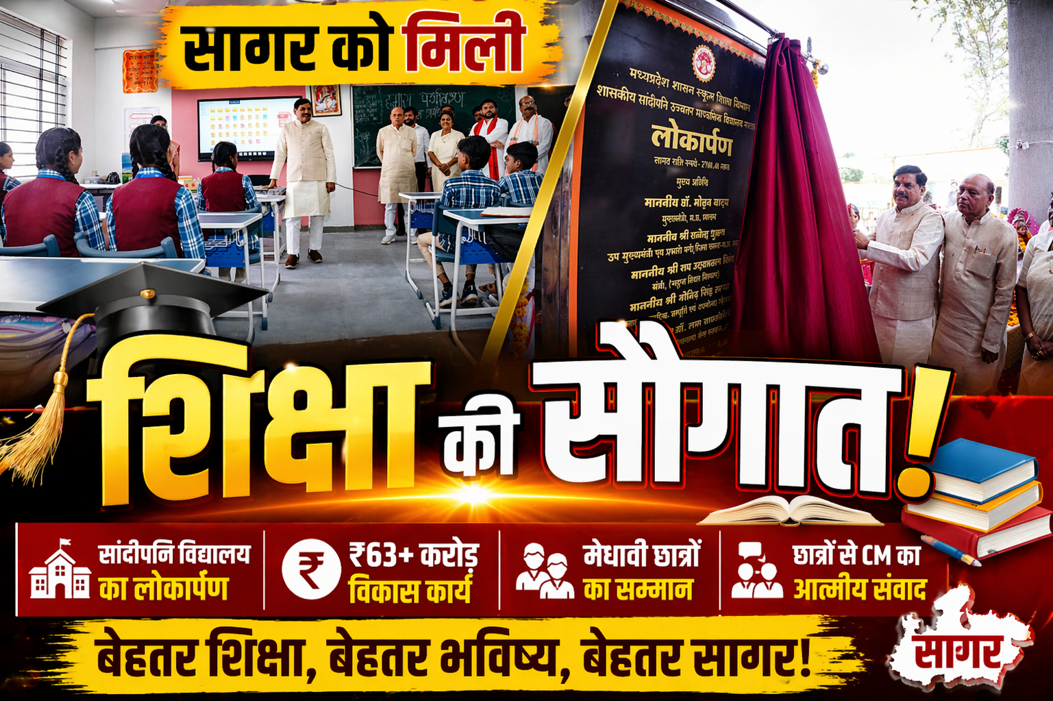 मध्यप्रदेश के सागर जिले के नरयावली क्षेत्र में शिक्षा और विकास को नई दिशा देने वाला बड़ा कार्यक्रम आयोजित किया गया। मुख्यमंत्री डॉ. मोहन यादव ने यहां सांदीपनि विद्यालय का लोकार्पण किया और ₹63 करोड़ से अधिक लागत के विभिन्न विकास कार्यों का भूमिपूजन एवं लोकार्पण किया।